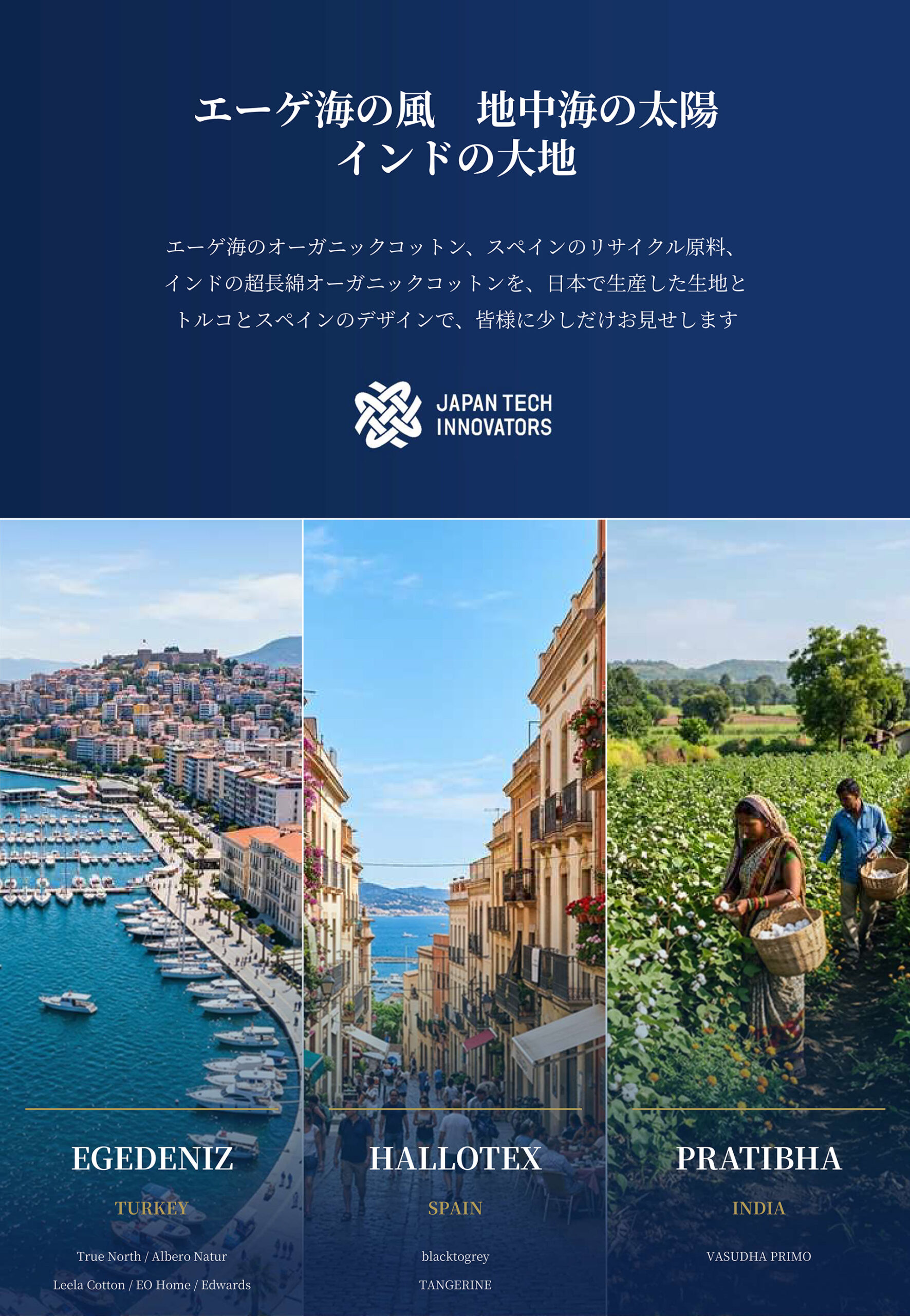 エーゲ海のオーガニックコットン、スペインのリサイクル原料、インドの超⾧綿オーガニックコットンを、日本で生産した生地とトルコとスペインのデザインで、皆様に少しだけお見せします。